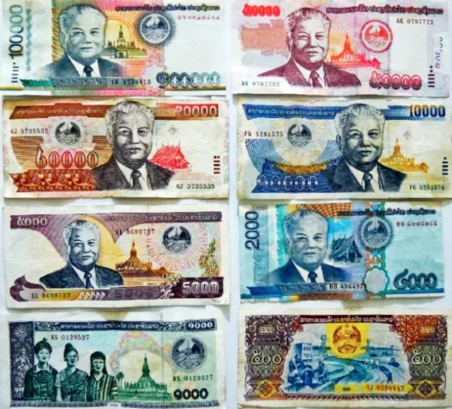 500킵, 1,000킵, 2,000킵, 5,000킵, 10,000킵, 20,000킵, 50,000킵, 100,000킵으로 총 8개의 화폐가 유통중입니다