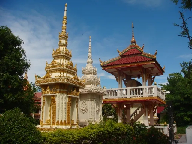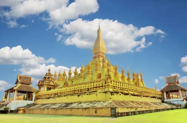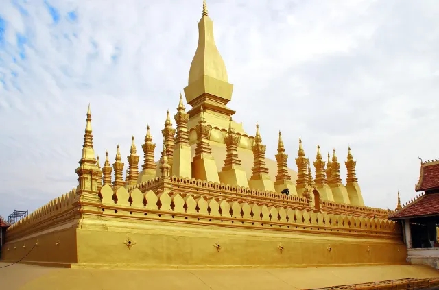 탓루앙 사원은 라오스의 국장과 지폐에도 사용될 정도로 라오스에서 가장 신성시 되는 탑이 있습니다. 연꽃 봉우리를 형상화 한 사리탑은 69cm 직사각형 기단 위에 45cm 높이의 탑으로, 기단부에는 30여개의 탑이 둘러싸여 있으며, 해당 탑의 꼭대기는 진짜 금으로 만들어졌다고 합니다.